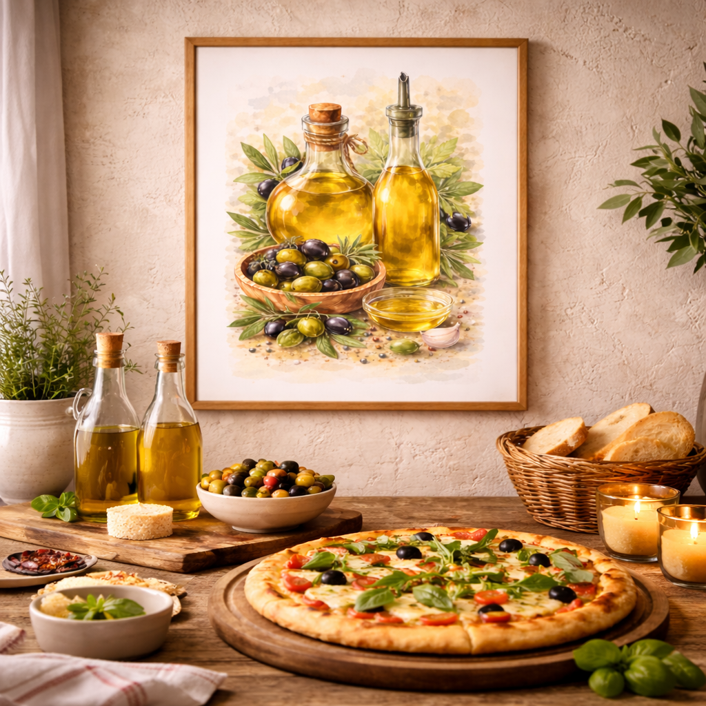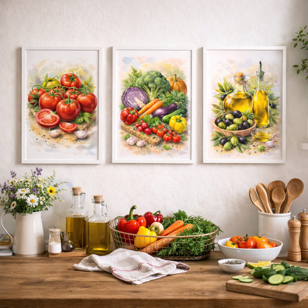 Add a warm and inviting touch to your home with this set of 3 downloadable decorative kitchen posters . Illustrated in an elegant watercolor style, these posters showcase iconic ingredients of Mediterranean cuisine: tomatoes, fresh vegetables, olive oil, and olives.
