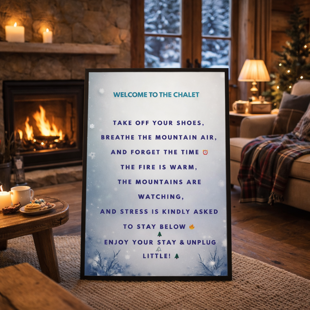 This printable wall art, titled "Welcome to the Chalet," instantly evokes a sense of comfort and well-being. It blends seamlessly into a winter, chalet, or cozy-style wall decor and is perfect for an entryway, living room, or any inviting living space.