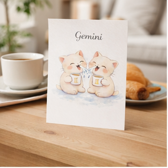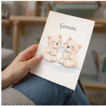 Cette illustration représente l’énergie vive et lumineuse des Gémeaux à travers un design doux et harmonieux, inspiré de la symbolique des jumeaux.